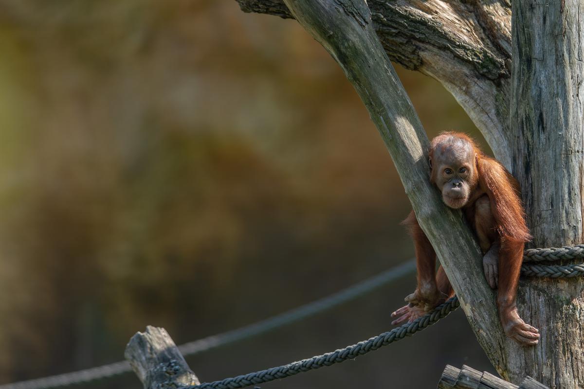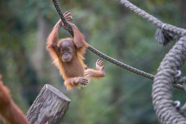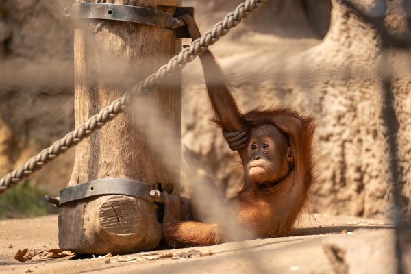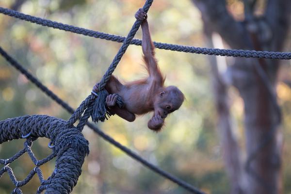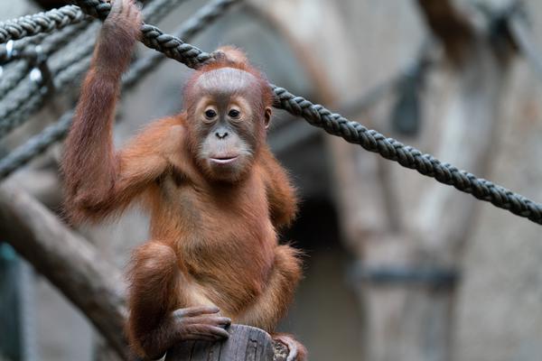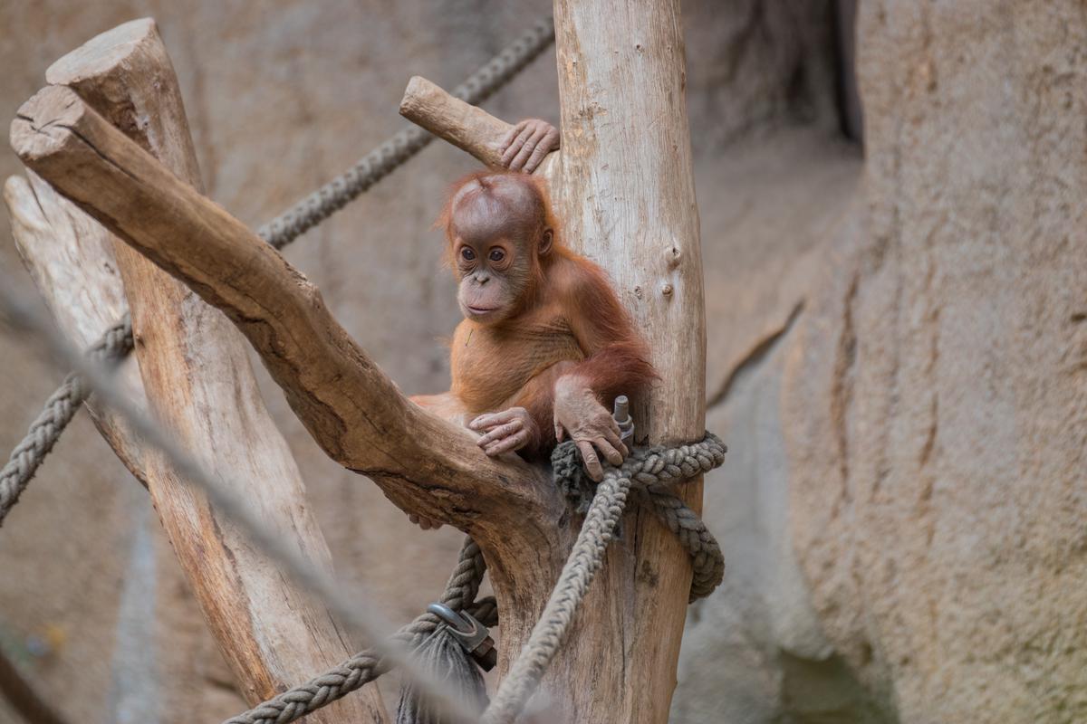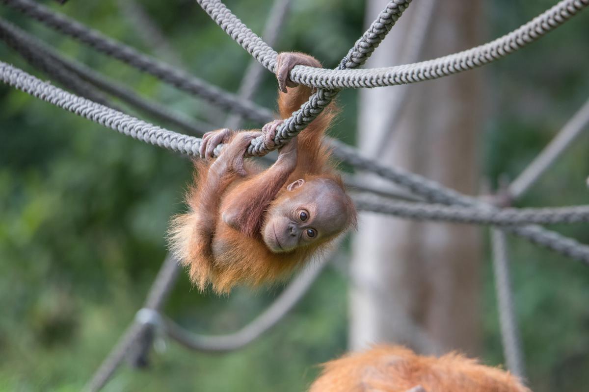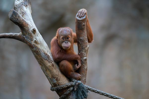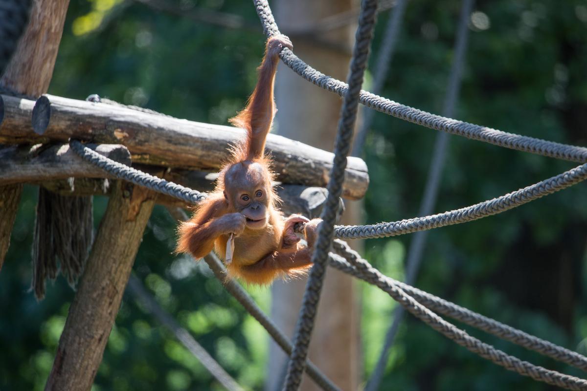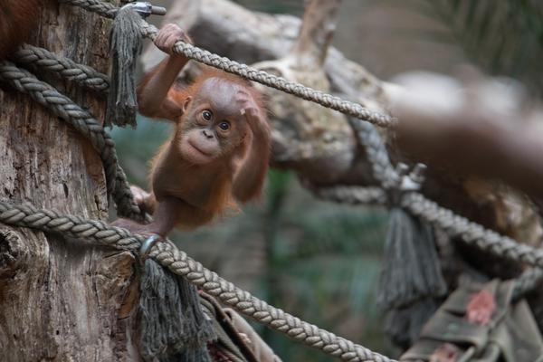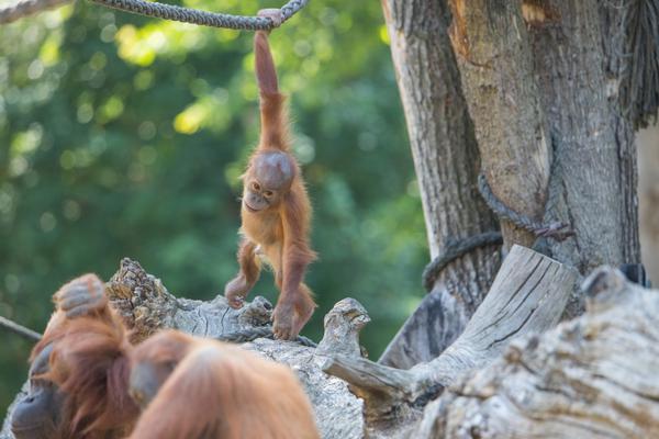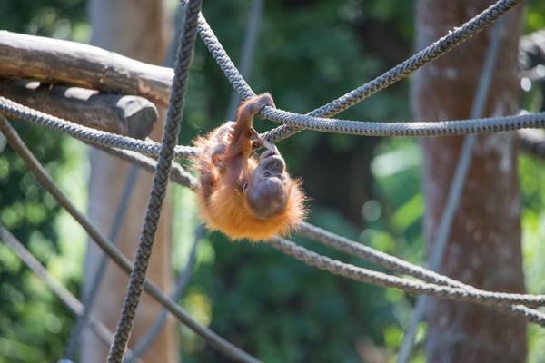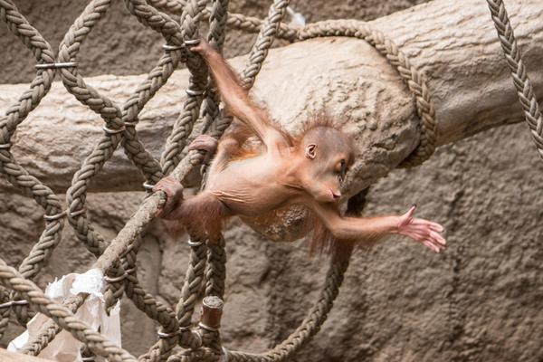 Bei den Orang-Utans gibt es aktuell zwei Jungtiere, Marok (März 2017) und Sari (August 2017). Ich kann mir nicht helfen, mich erinnern die Kleinen mit ihren Falten und ihrer kargen Frisur einfach an alte Menschen. Trotzdem sind die beiden unglaublich süß und nach einer anfänglich etwas angespannten Lage geht spätestens seit dem zweiten Jungtier auch alles wieder friedlich seinen Gang. Inzwischen unternehmen die kleinen Orangs auch schon eigenständige Kletterversuche. Häufig konnte ich zudem beobachten, wie sich eine der Mütter gleich um beide kleinen Racker kümmert.