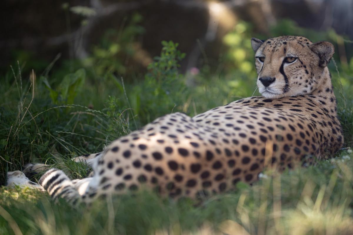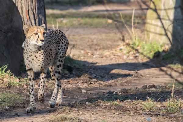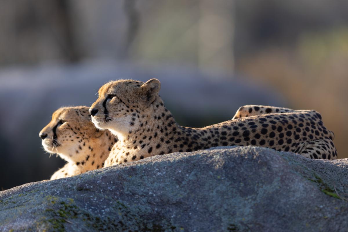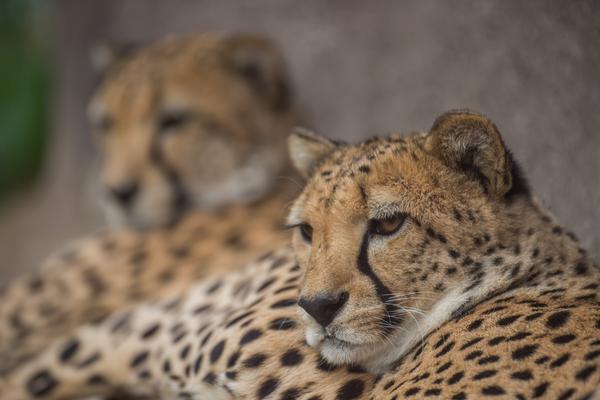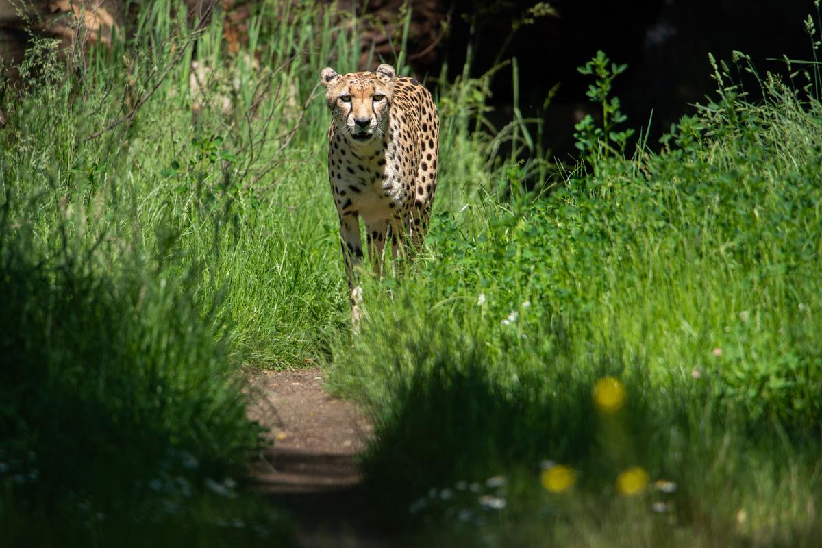 Wenn sie an ihrem angestammten Platz hinter der Scheibe liegen, fixieren sie den Besucher oft mit eindringlichem Blick. Die Tiere sitzen natürlich nicht die ganze Zeit herum und beobachten die Besucher. Gerade in den frühen Stunden sind die beiden sehr aktiv und streifen über die Anlage. Dabei wird der eindrucksvolle, wenn auch etwas eigenartige Körperbau eines Tieres deutlich, welcher perfekt für die schnelle Bewegung optimiert ist.